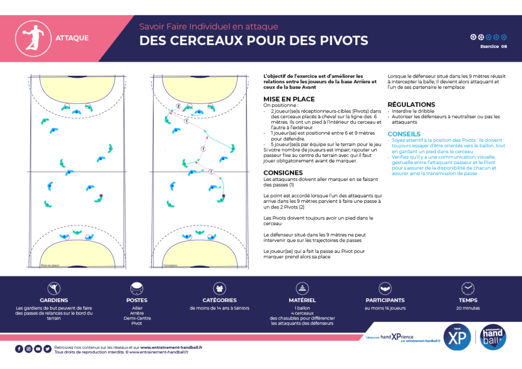 – 2 joueur(se)s réceptionneurs-cibles (Pivots) dans des cerceaux placés à cheval sur la ligne des 6 mètres. Ils ont un pied à l’intérieur du cerceau et l’autre à l’extérieur.
