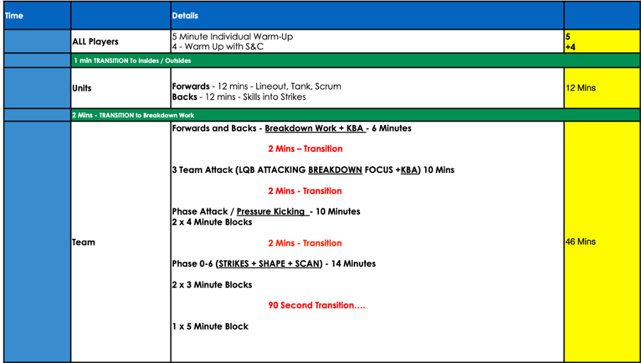 Mon entrée préférée passe par une petite séance vidéo pour y montrer l’objectif de la séance et le pourquoi tout en y détaillant rapidement le contenu de la séance et le timing comme ci-dessous dans mon club anglais de Bath Rugby :