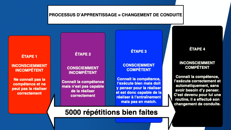 Le passage d’inconsciemment/incompétent à inconsciemment/compétent passe par les étapes 2 et 3 et demande donc énormément de répétitions.