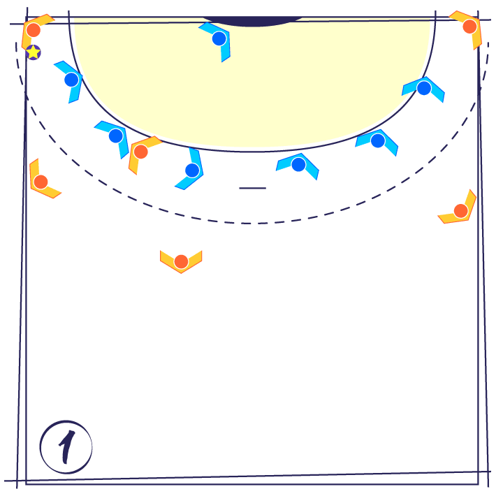 Cette tactique d’attaque fonctionne sur une défense 0-6 de zone car les défenseurs suivent le ballon mais elle est aussi utilisable sur une défense 0-6 homme à homme (plus rarement utilisée !)