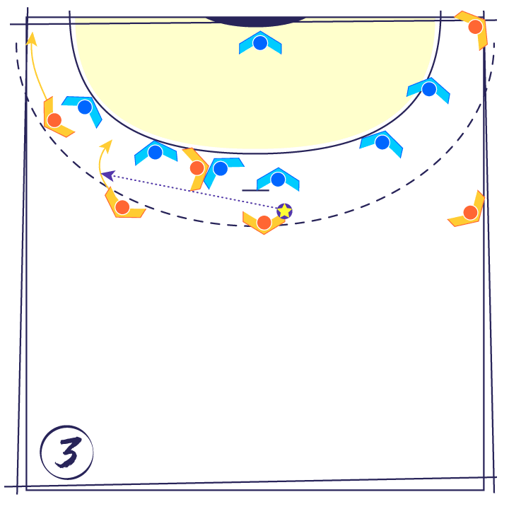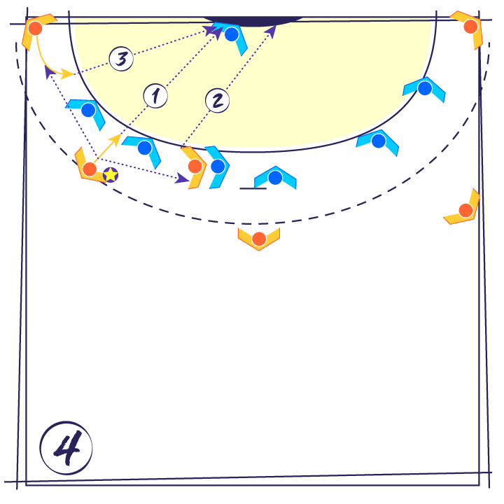 - Si le défenseur n°1 se repositionne devant l’Ailier et le n°2 reste sur le Pivot, alors l’Arrière latéral reçoit le ballon et s’engage dans l’intervalle entre le n°1 et le n°2