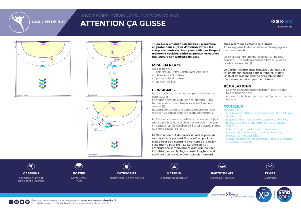 Tir en contournement du gardien ; placement en profondeur et prise d’information sur les comportements du tireur pour anticiper l’impact recherché et vision périphérique sur les courses des joueurs non-porteurs de balle