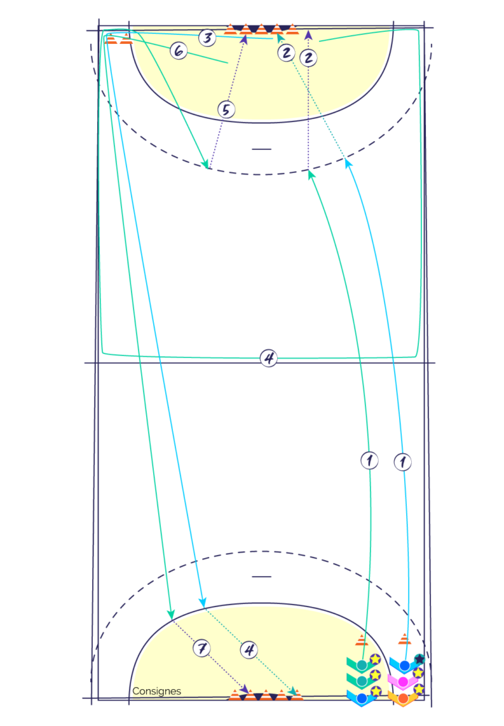Si le tireur touche le plot, il se relève, récupère son ballon et dribble d’abord vers le «point de retour» pour faire le tour des plots et traverse à nouveau le terrain jusqu’au 6 mètres (3). Ils se couchent alors sur le ventre et enchainent avec un tir couché à 6 mètres (4).
