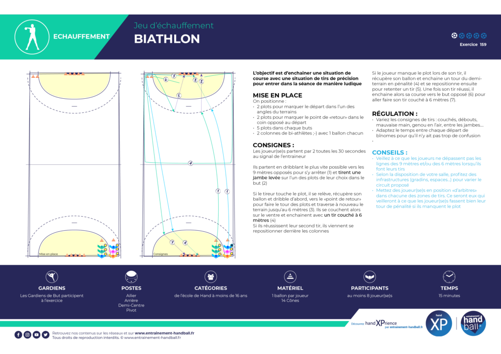 L’objectif est d’enchainer une situation de course avec une situation de tirs de précision pour entrer dans la séance de manière ludique.