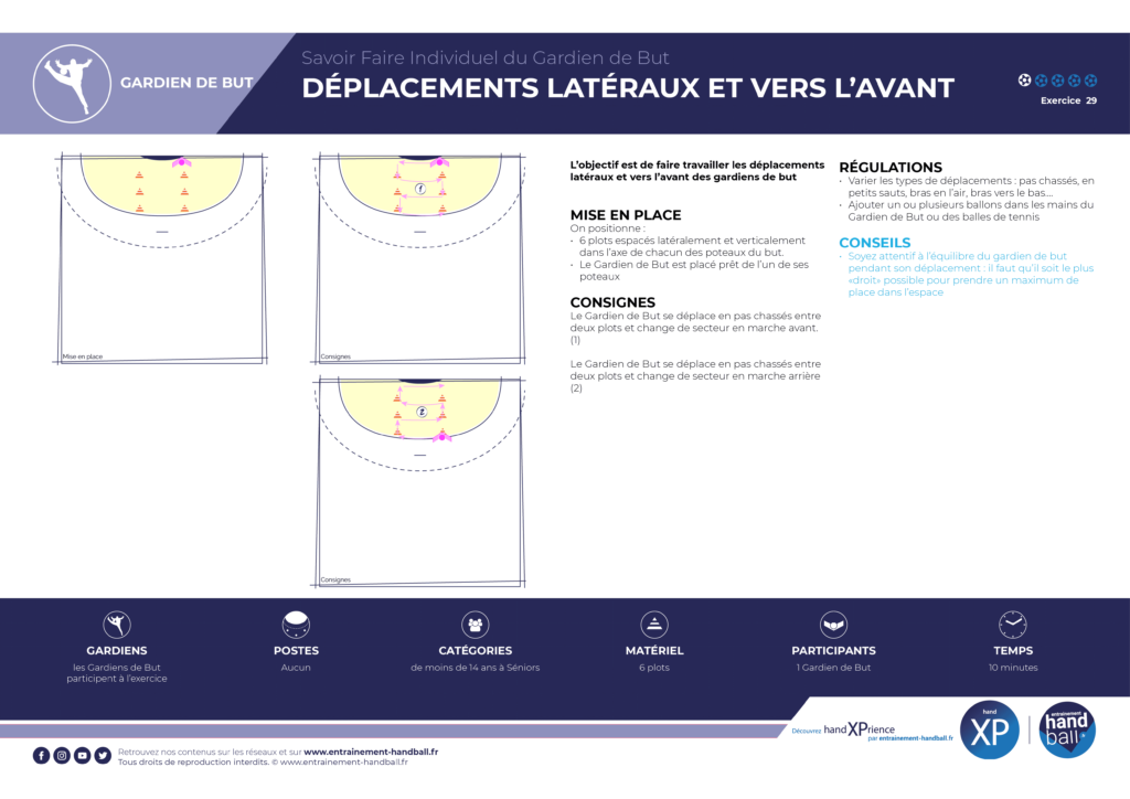 L’objectif est de faire travailler les déplacements latéraux et vers l’avant des gardiens de but