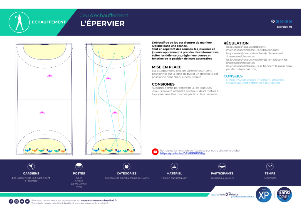 Au signal donné par l’entraîneur, les joueuses/joueurs doivent atteindre l’intérieur des 9 mètres à l’opposé sans être touchés par le ou les chasseurs.