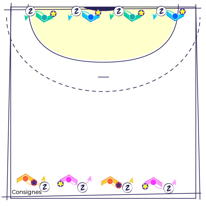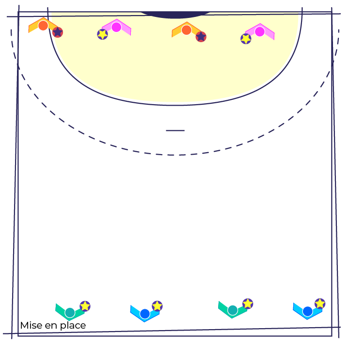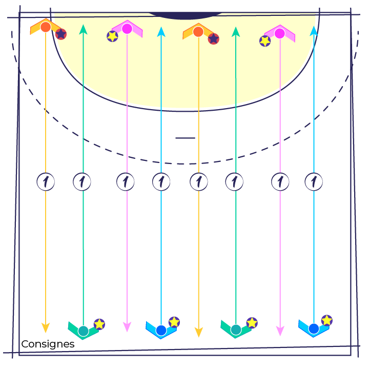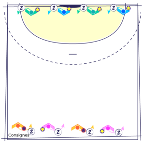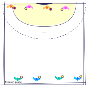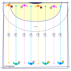 Les joueur(se)s sont répartis en 2 groupes équivalents et placés de part et d’autre de la zone d’entraînement.