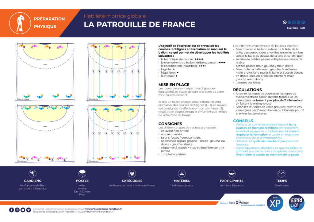 L’objectif de l’exercice est de travailler les courses rectilignes en formation en maniant le ballon :