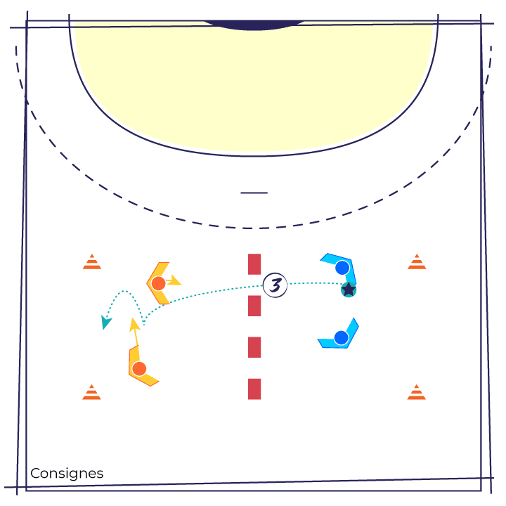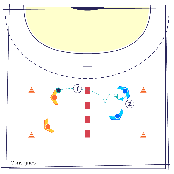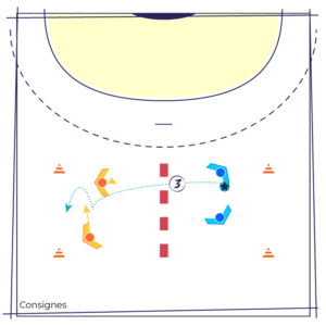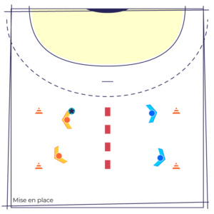 Les joueur(se)s sont répartis en groupes de 4 avec 1 ballon et constituent des équipes de 2 placées dans chaque camp.
