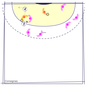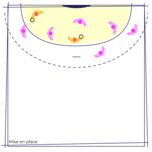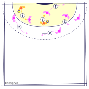 L’objectif est d’apprendre aux joueurs à coordonner leurs déplacements dans l’espace tout en maîtrisant diverses contraintes : ballon, partenaire…