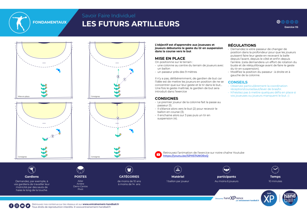 – Observez particulièrement la coordination réception/course/saut/lever de bras/tir.