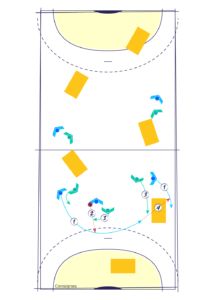 Pour marquer un point, les attaquants doivent parvenir à se faire une passe au-dessus d’un des tapis (4).