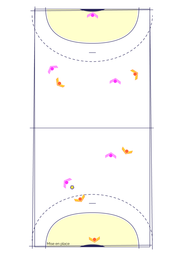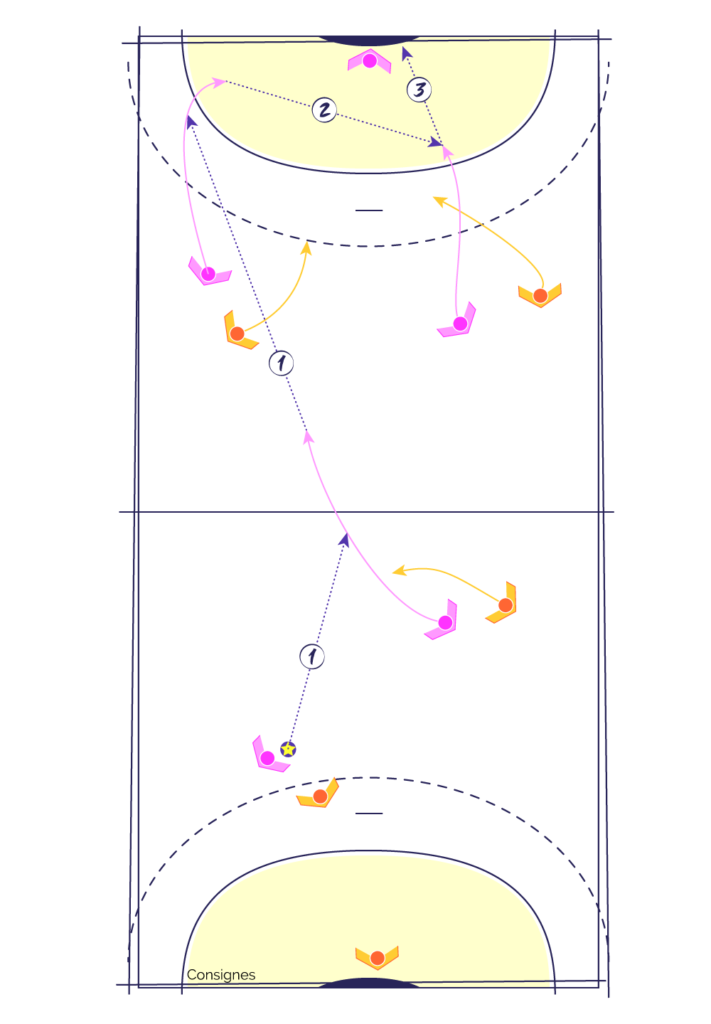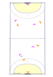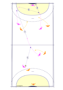 Sur tout le terrain, en dehors des 9 mètres, les joueur(se)s se font des passes au pied (1).