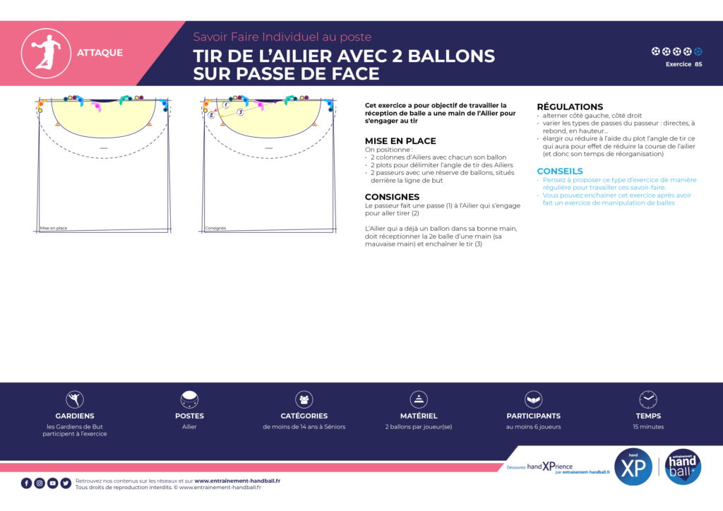 L’Ailier qui a déjà un ballon dans sa bonne main, doit réceptionner la 2e balle d’une main (sa mauvaise main) et enchaîner le tir (3).