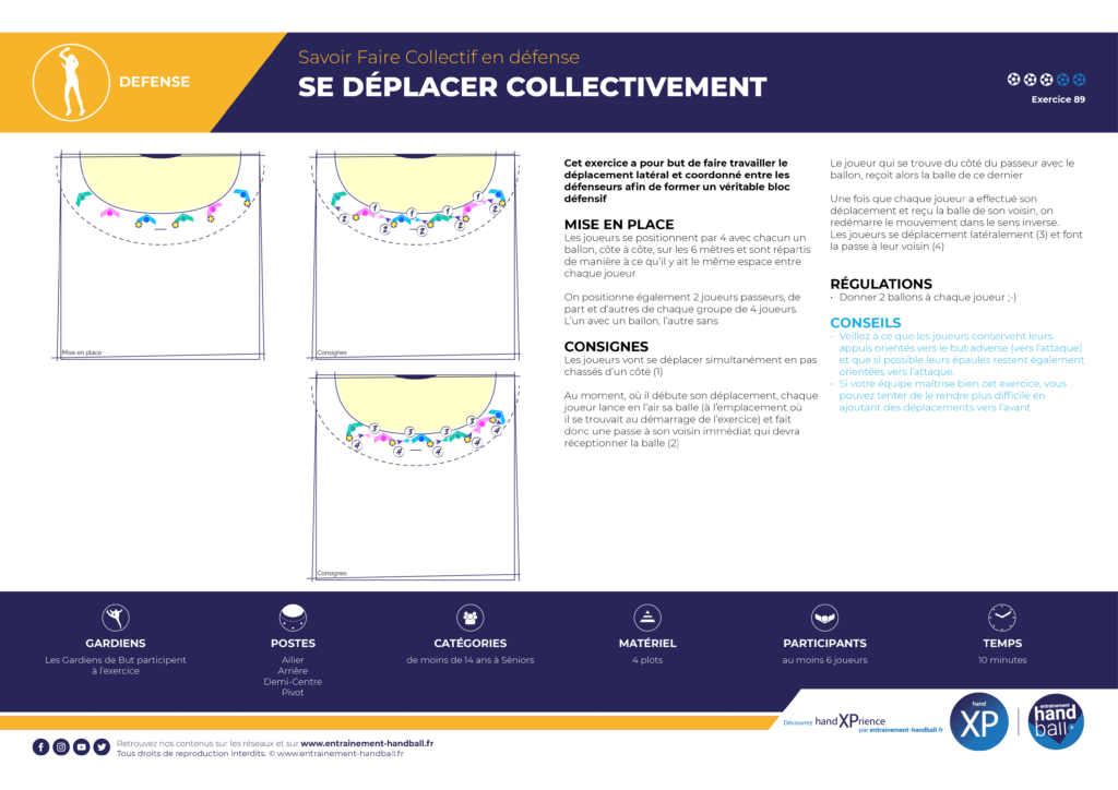 Cet exercice a pour but de faire travailler le déplacement latéral et coordonné entre les défenseurs afin de former un véritable bloc défensif.