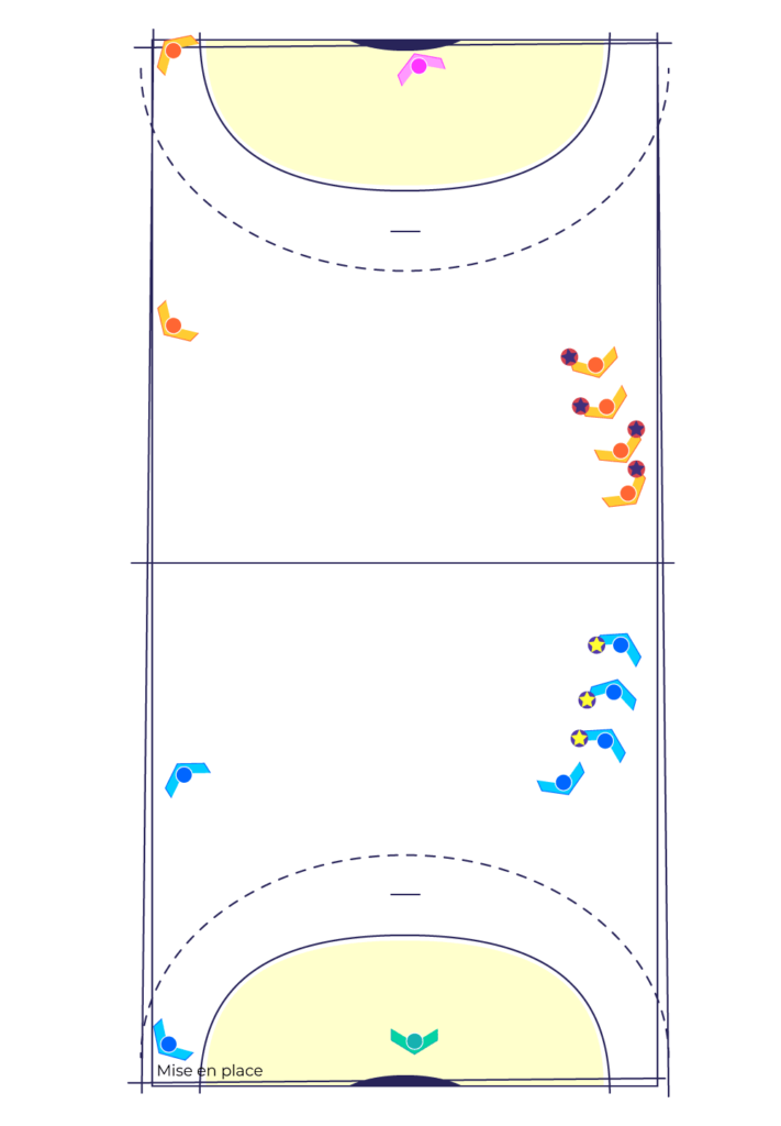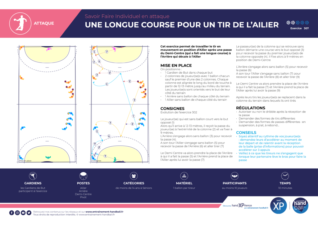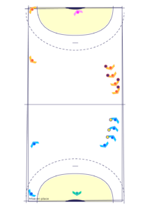 Cet exercice permet de travailler le tir en mouvement en position d’Ailier après une passe du Demi-Centre (qui a fait une longue course) à l’Arrière qui décale à l’Ailier.