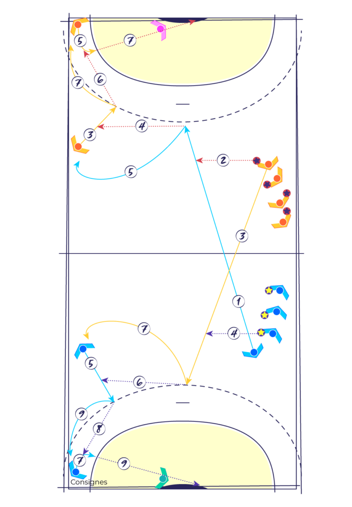 Le passeur de la colonne qui se retrouve sans ballon démarre une course vers le but opposé (3) pour recevoir la passe du premier joueur de la colonne opposée (4). Il fixe alors à 9 mètres en position de Demi-Centre.