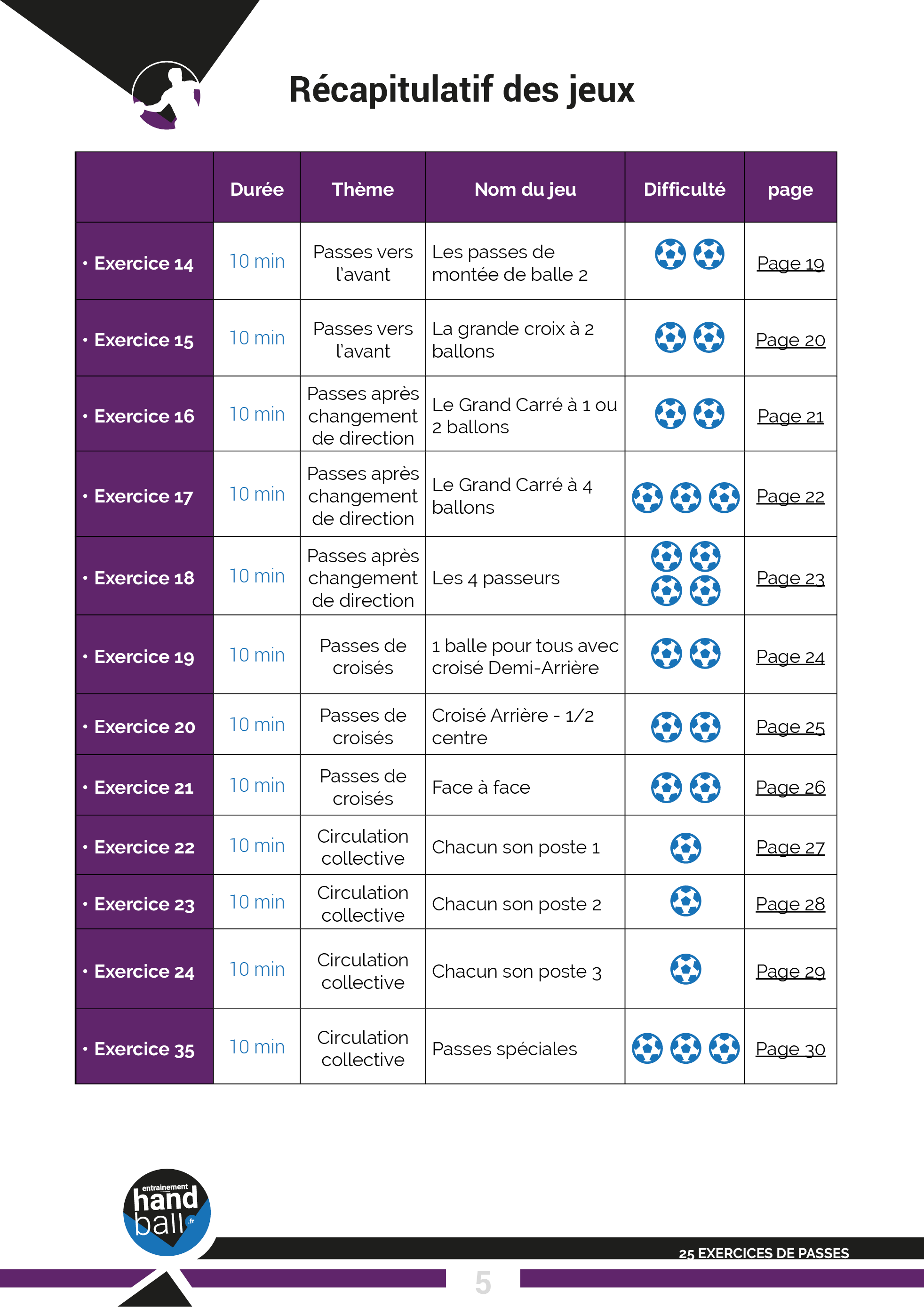 Le guide comprend 25 exercices courts (10 minutes chacun), classés par type de passes et par niveau de difficulté (de 1 à 4 ballons).